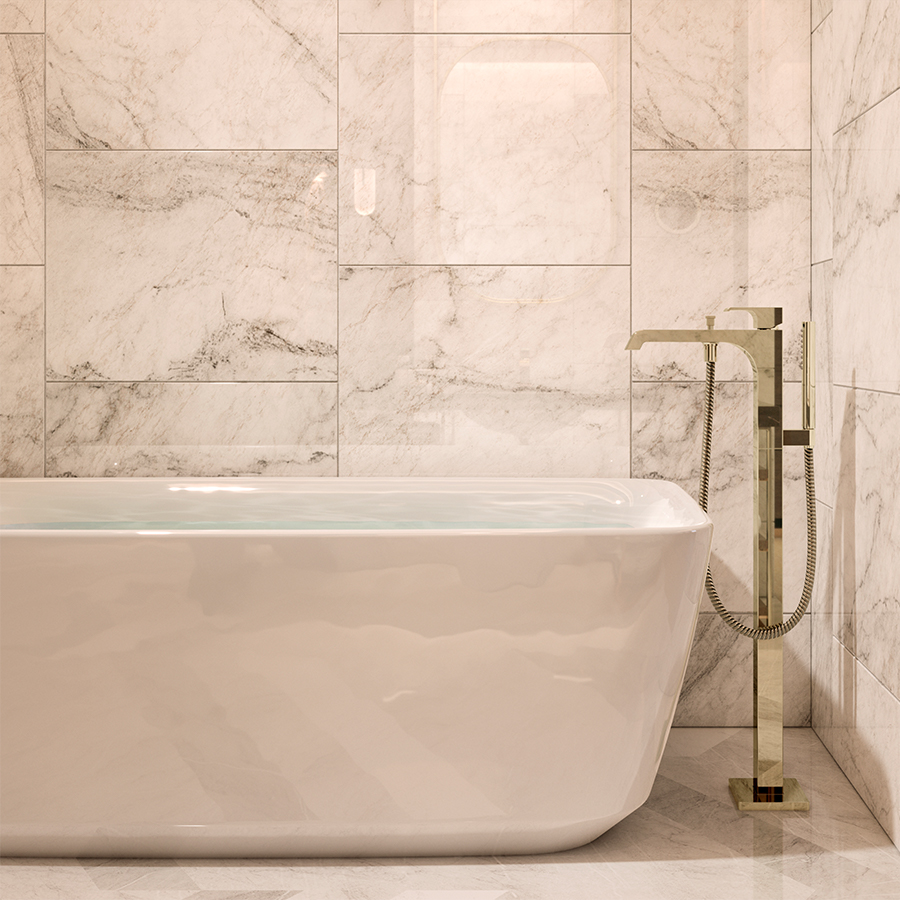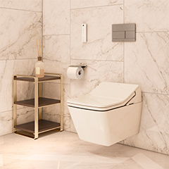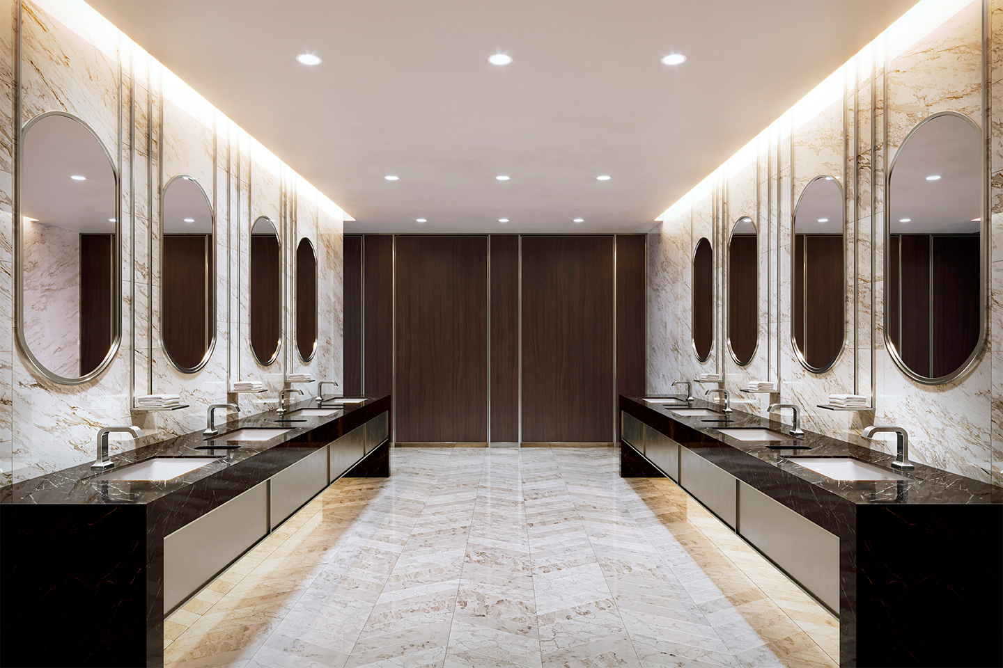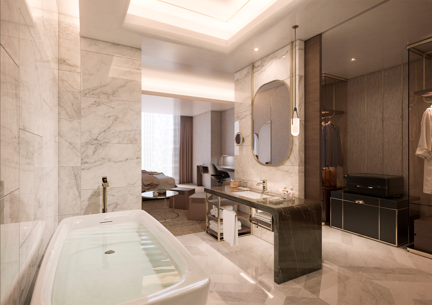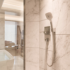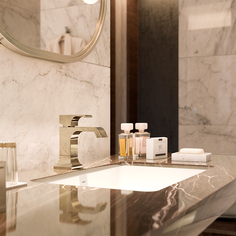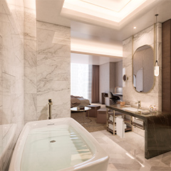 The TOTO faucet family throughout the suite epitomizes timeless sophistication and contemporary elegance, making a striking design statement that harmonizes with the distinctive interior elements such as oversize oval mirrors, and pendant lights.