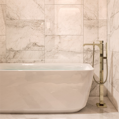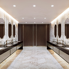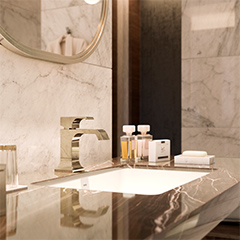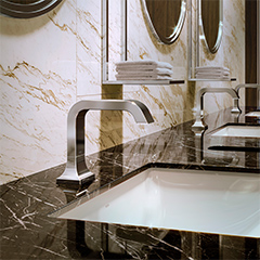 This hotel bath space is characterized by warm beige marble wall tiles and contrapuntal black marble vanity. The space is unified by its use of Polished Bronze faucets and accessories, which echo the warm beige walls, creating a fascinating design statement.