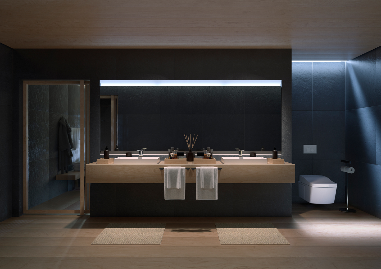 This urban bathroom incorporates many elements from the natural world, such as cypress ceiling tiles, a cypress vanity, and jet-black limestone wall tile.