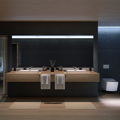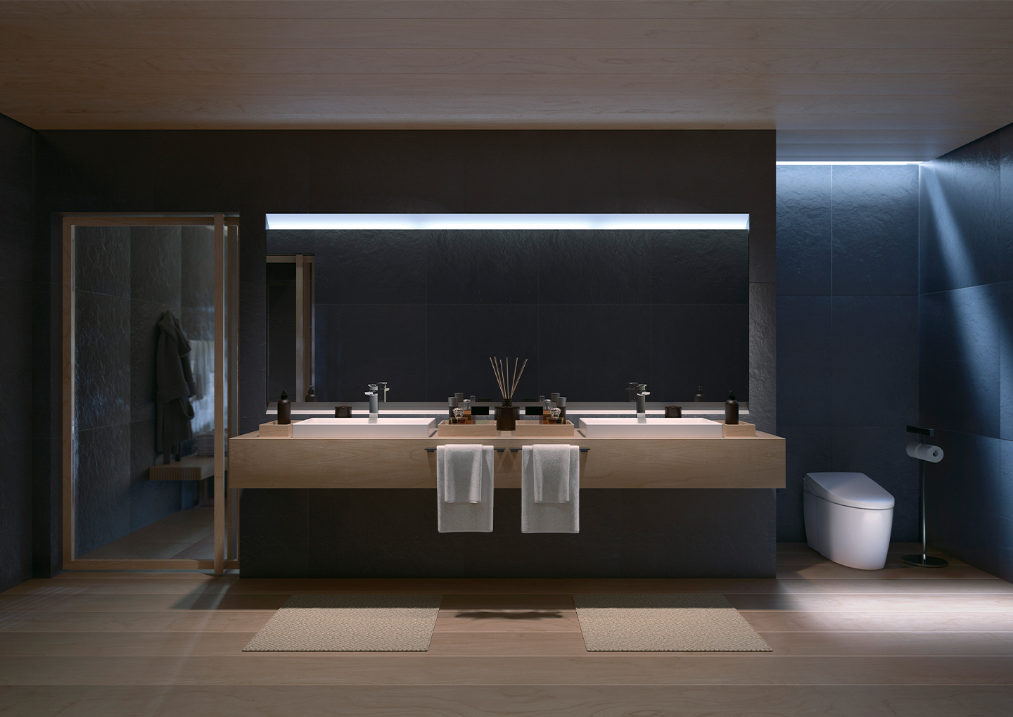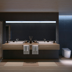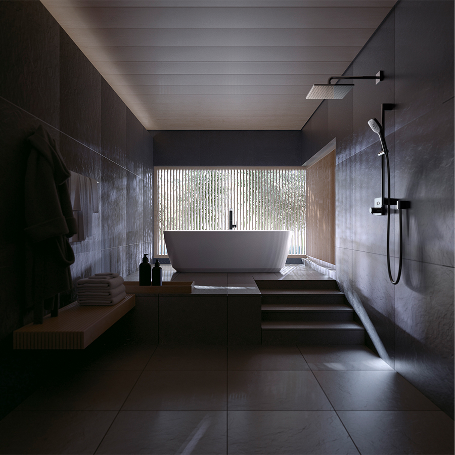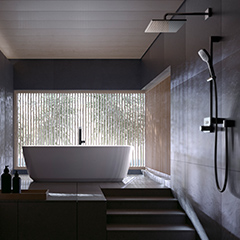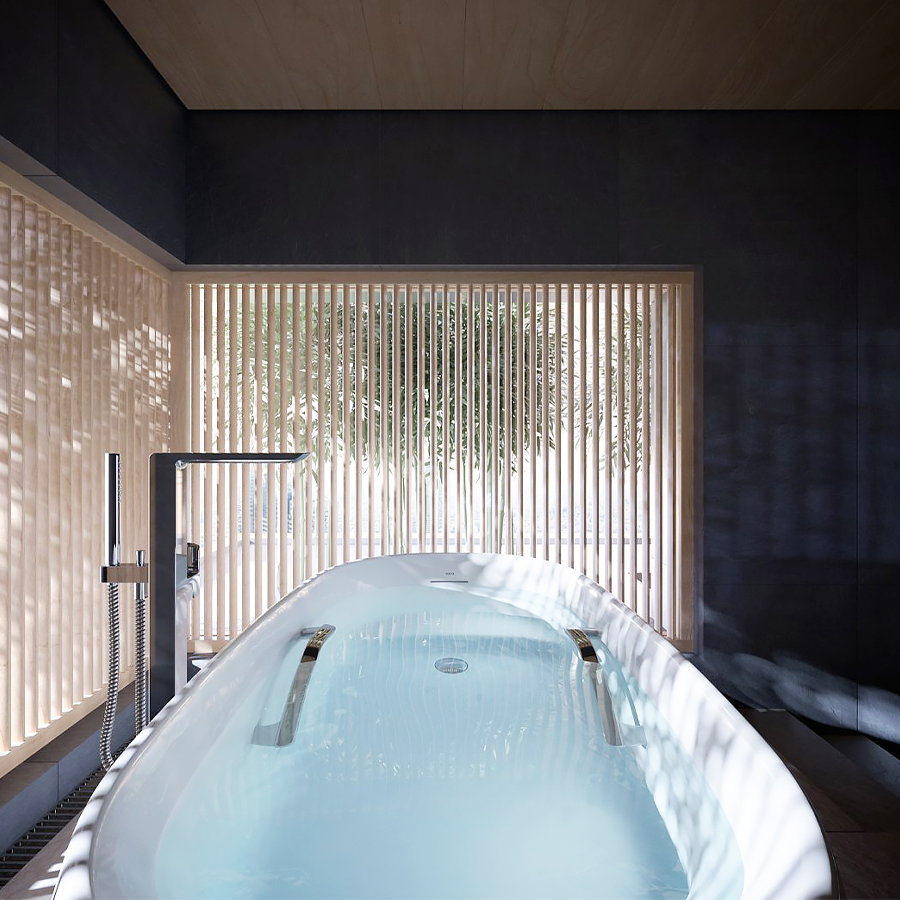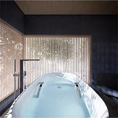 The wooden Venetian blinds' shape is reflected in the water of the bathtub, and you can enjoy the beautiful variations of its shadow as time goes by.