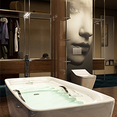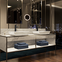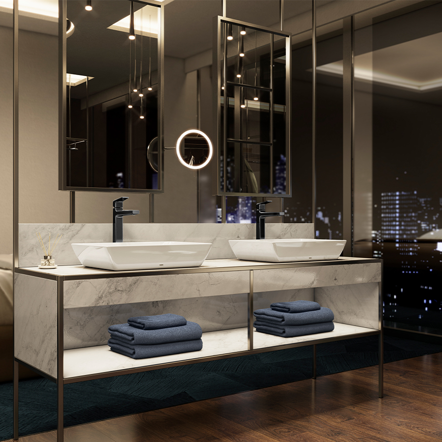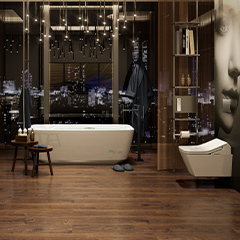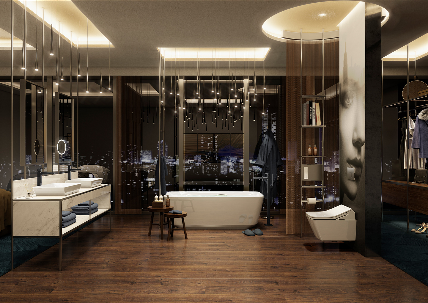 This bath environment offers you the opportunity to enjoy a quiet moment drinking in the magnificent cityscape at night, which affects the senses like a contemporary painting of the urban landscape.